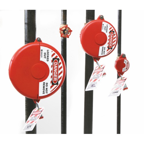 Zestaw blokad do zaworów zasuwowych marki Brady zawiera wszystkie rozmiary blokady do zasuw o średnicy od 25 do 330 mm średnicy pokrętła.