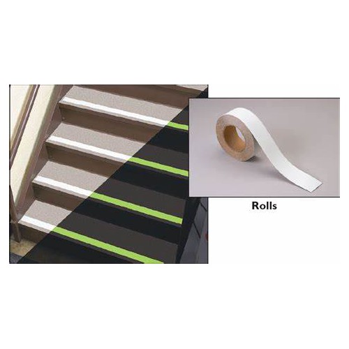 Samoprzylepne antypoślizgowe taśmy na podkładzie aluminiowym do znakowania krawędzi schodów i przejść. Taśmy wykonane są z materiału świecącego w ciemności światłem, które zaabsorbowały w ciągu dnia.