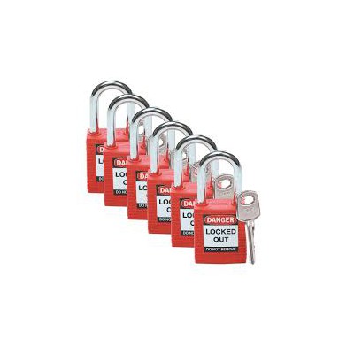 - Zestaw 6 szt. czerwonych kłódek bezpieczeństwa z korpusem z tworzywa