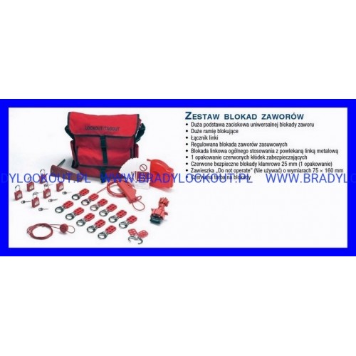 Jest to profesjonalny zestaw blokad Brady Lock-out Tag-out umożliwiający blokowanie różnej wielkości zaworów, zasuw, przepustnic oraz innych elementów sterujących na rurociągach. Zestaw blokad Lockout Brady 806175 może stanowić podstawowy zestaw blokad dla małego zespołu utrzymania ruchu, działu produkcji lub dla serwisantów. Jest to zestaw blokad Brady Lock-out do zaworów dostosowany do standardów europejskich i polskich..